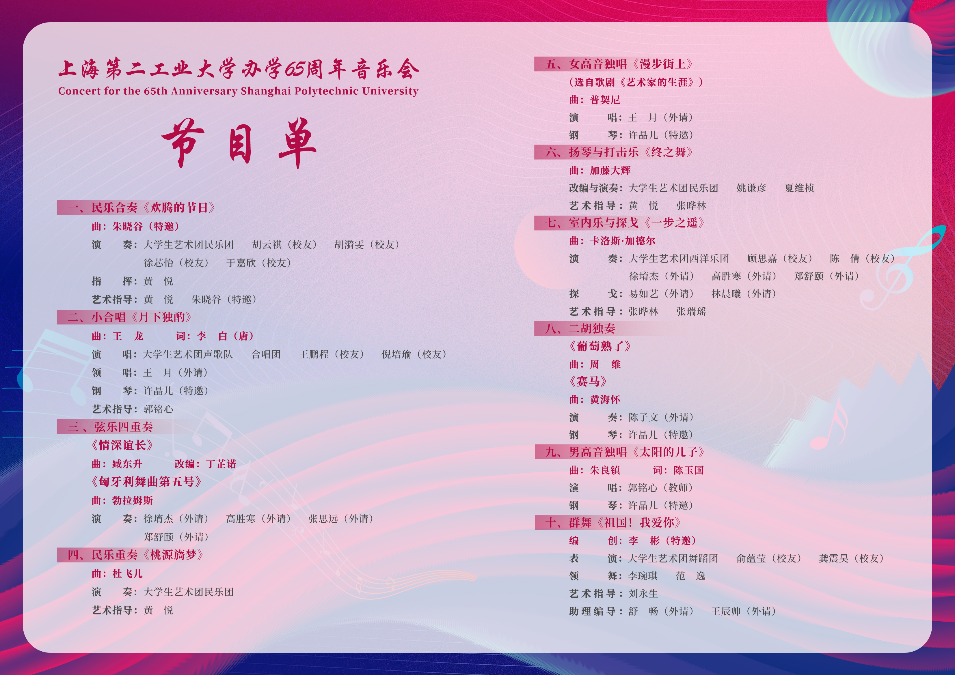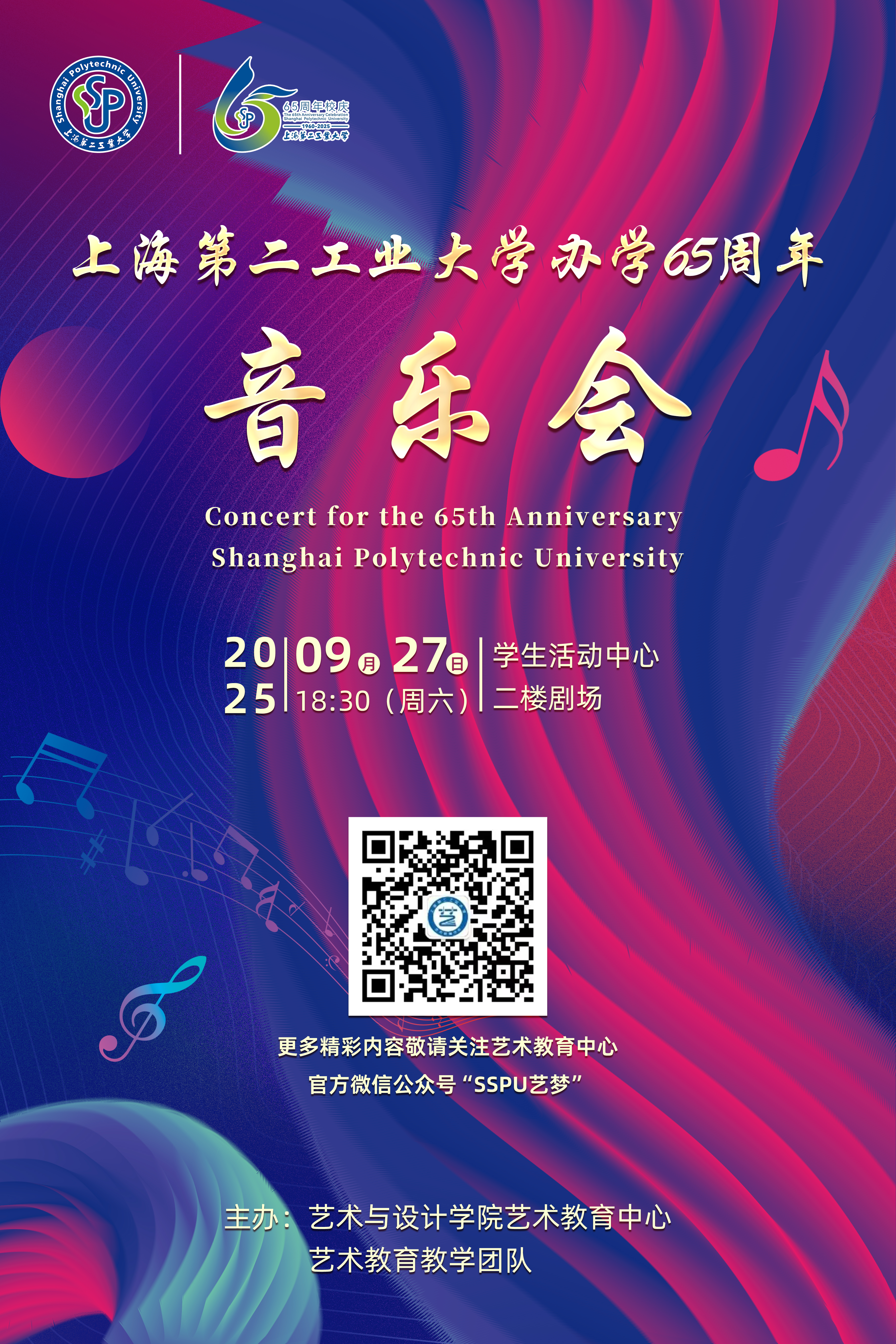 上海第二工业大学办学65周年音乐会索票通知2025年9月27日(星期六)18:30,将在学生活动中心二楼剧场举行上海第二工业大学办学65周年音乐会,欢迎广大师生积极索票!